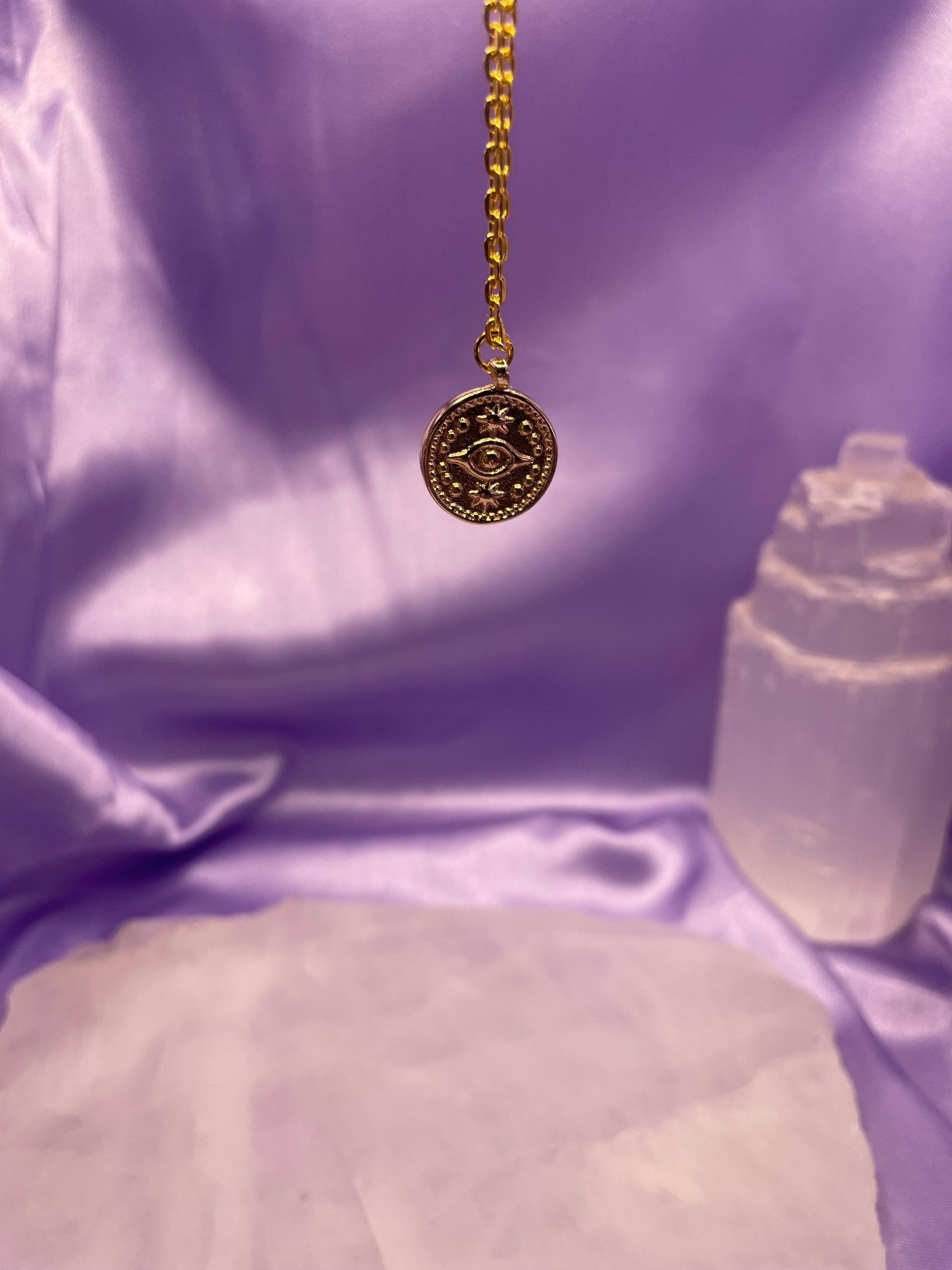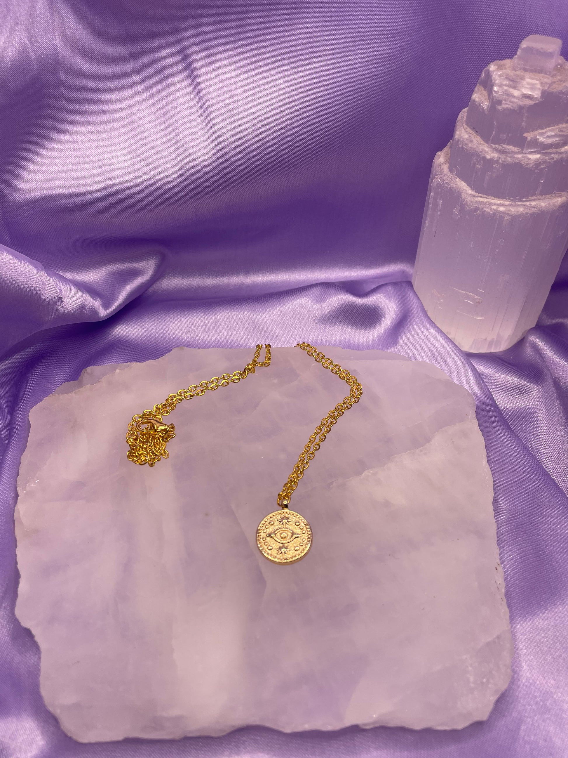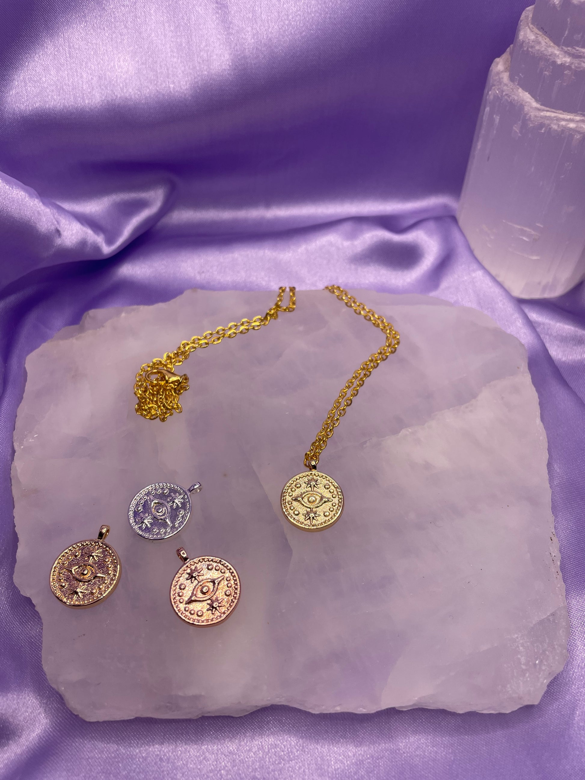 An evil eye coin necklace serves as a stylish talisman for protection against negative energy.